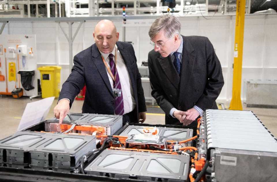 Image shows Business Secretary Jacob Rees-Mogg and UKBIC Managing Director Jeff Pratt inspect batteries being built.